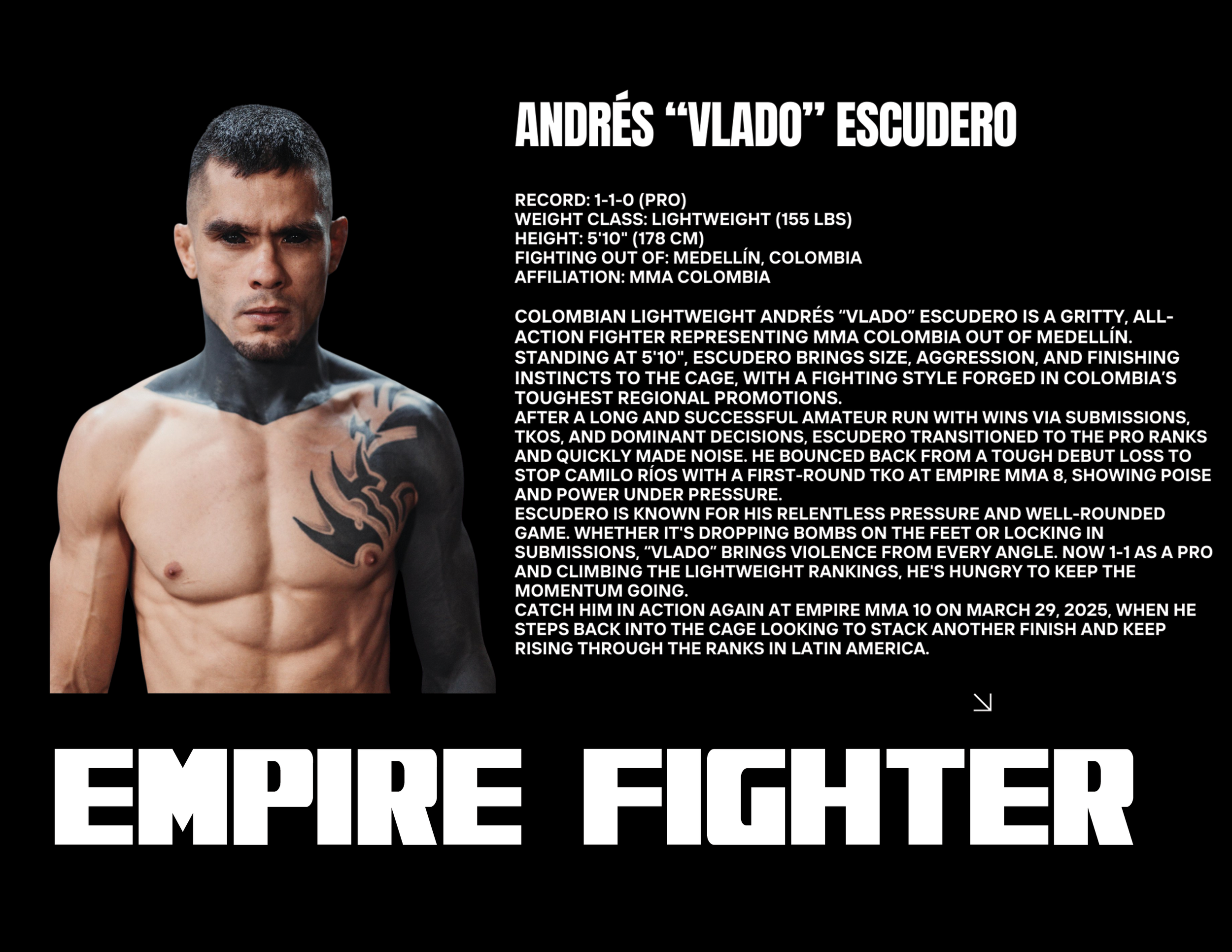 Profile of MMA fighter Andrés 'Vlado' Escudero with his stats and a description of his fighting style on a black background. He has short black hair, a serious expression, and a large dragon tattoo on his left shoulder and chest.