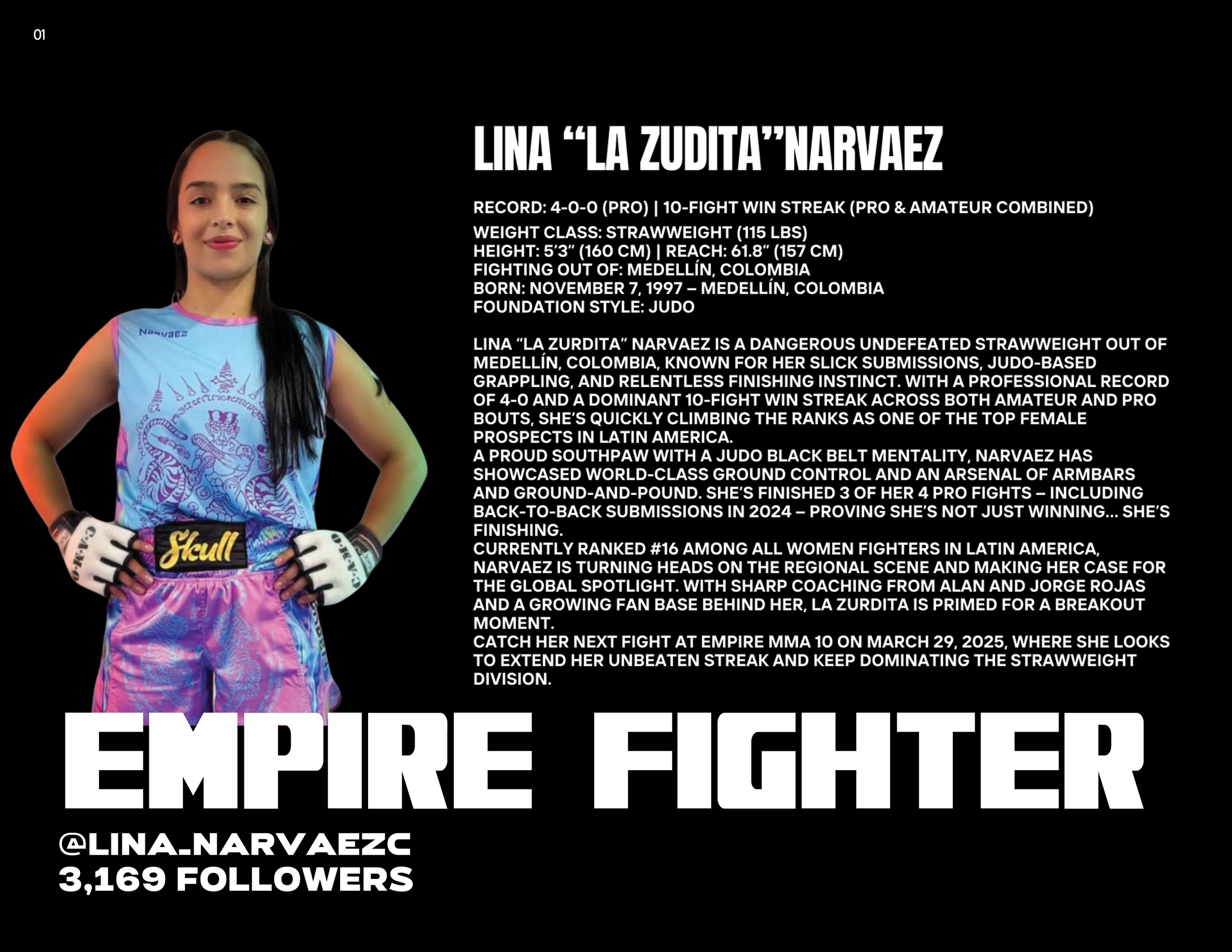 Image of a female fighter in colorful judo attire with text highlighting her achievements and background, including her name Lana "La Zurdita" Narvaez and her record of 4-0, along with her ranking and upcoming fight details.