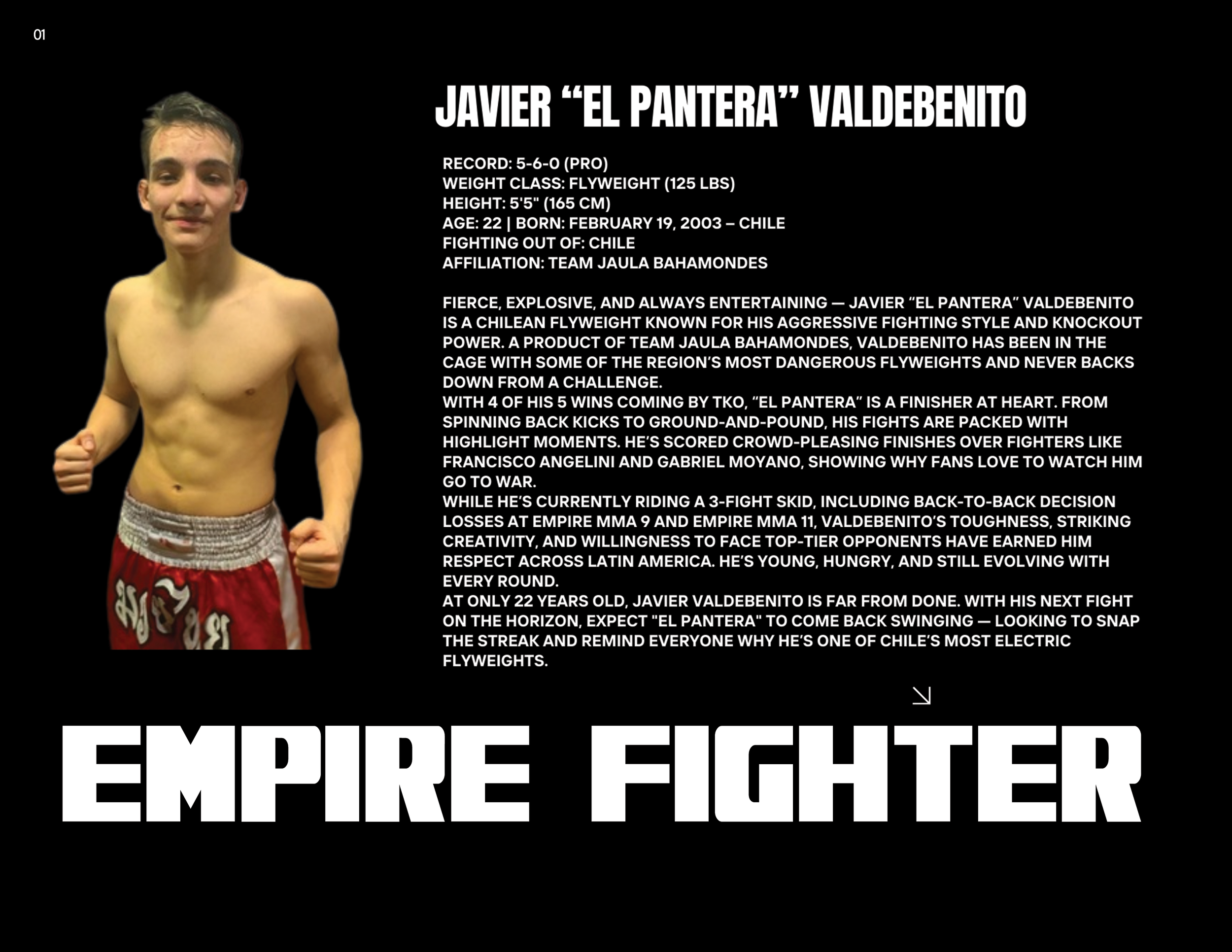 Profile of Javier El Pantera Valdebenito, a 22-year-old Chilean flyweight boxer, with a detailed biography and statistics on a black background, and large white text reading "Empire Fighter."