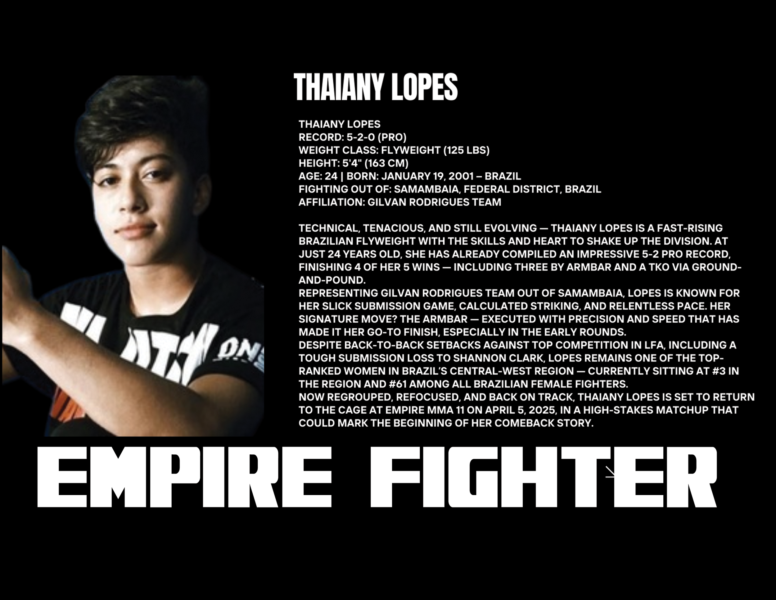 Profile image of Thaiany Lopes, a young Brazilian female mixed martial artist, with detailed biography and achievements, positioned next to her name in bold letters on a black background.